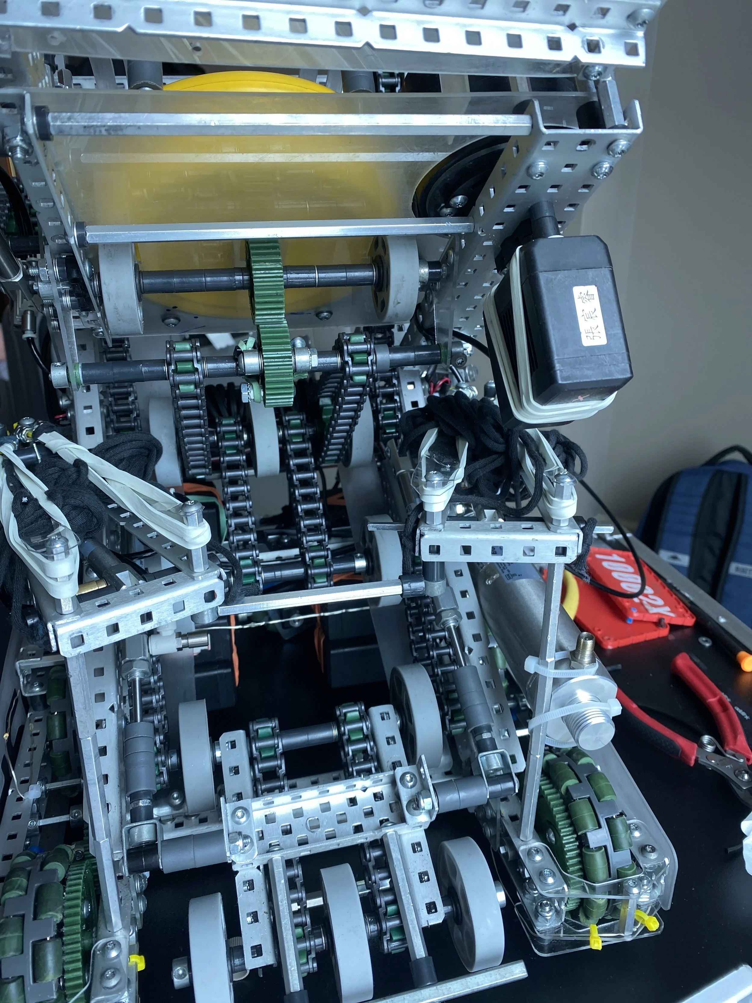 This robot is a competitive robot that was made to shoot frisbees into a βnetβ. It has a 4 motor drivetrain, a 600RPM ratcheted intake, and a 1200 RPM flywheel to shoot frisbees. It also includes a pneumatic-powered piston to adjust shooting angle to optimize game performance. There are two versions showcased here.