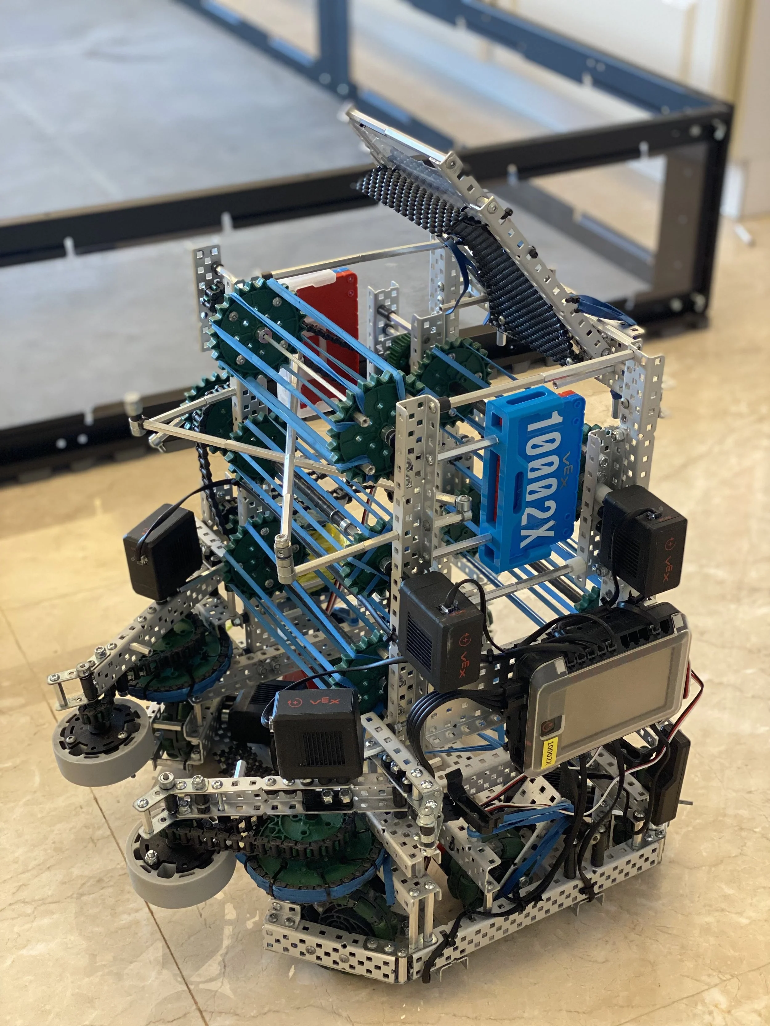 This robot is a competitive robot that was made to cycle balls and shoot balls into a rim. It has a 4 motor omni-directional drivetrain and a 600RPM intake system. It encorporates encoder-embedded tracking wheels and inertial sensors.